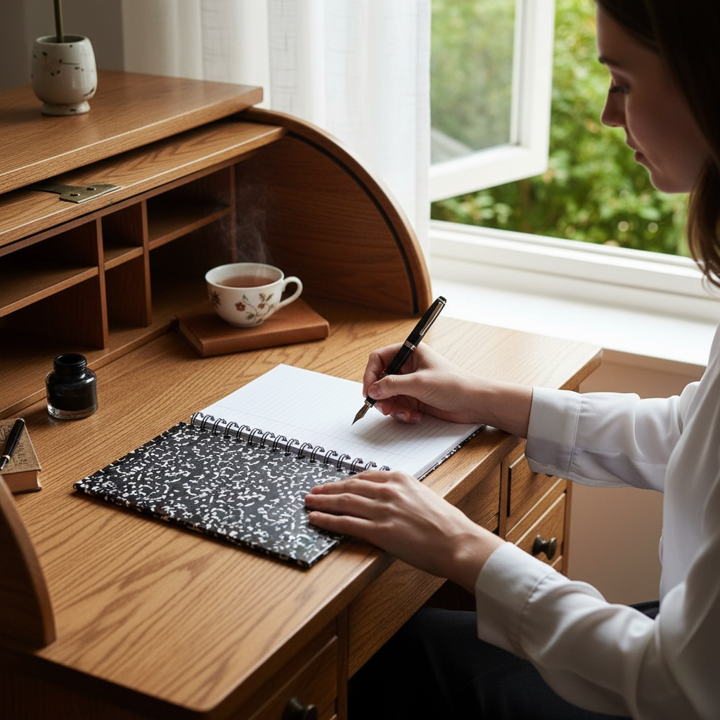 PAGES: 100 pages | 50 sheets of composition lined Kokuyo (fountain pen friendly!) paper. Line spacing is 5mm. Left margin is ⅞". There are 33 lines per page.