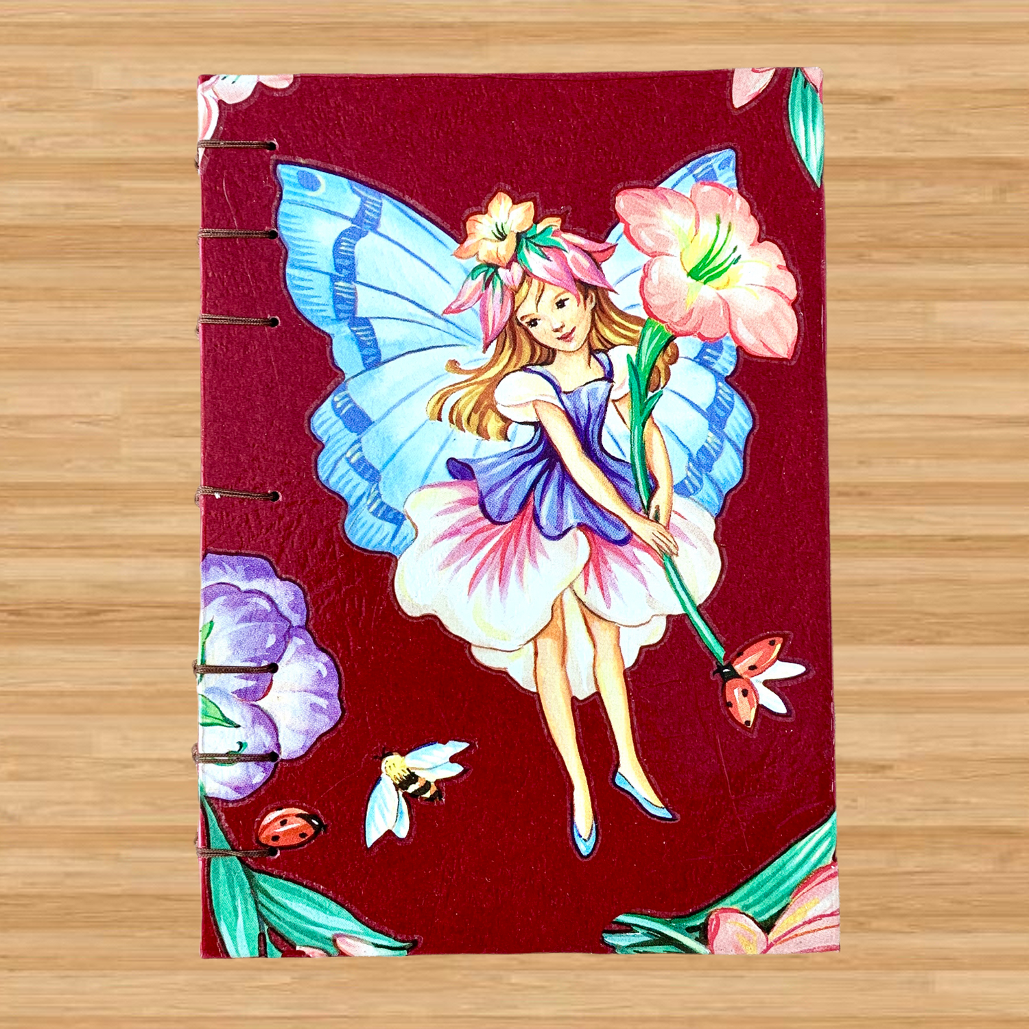 COVER: thick handmade recycled chipboard for everyday use. Textured cardstock covers the chipboard and a beautiful fairy transfer adorns the glossy-finish cover.
