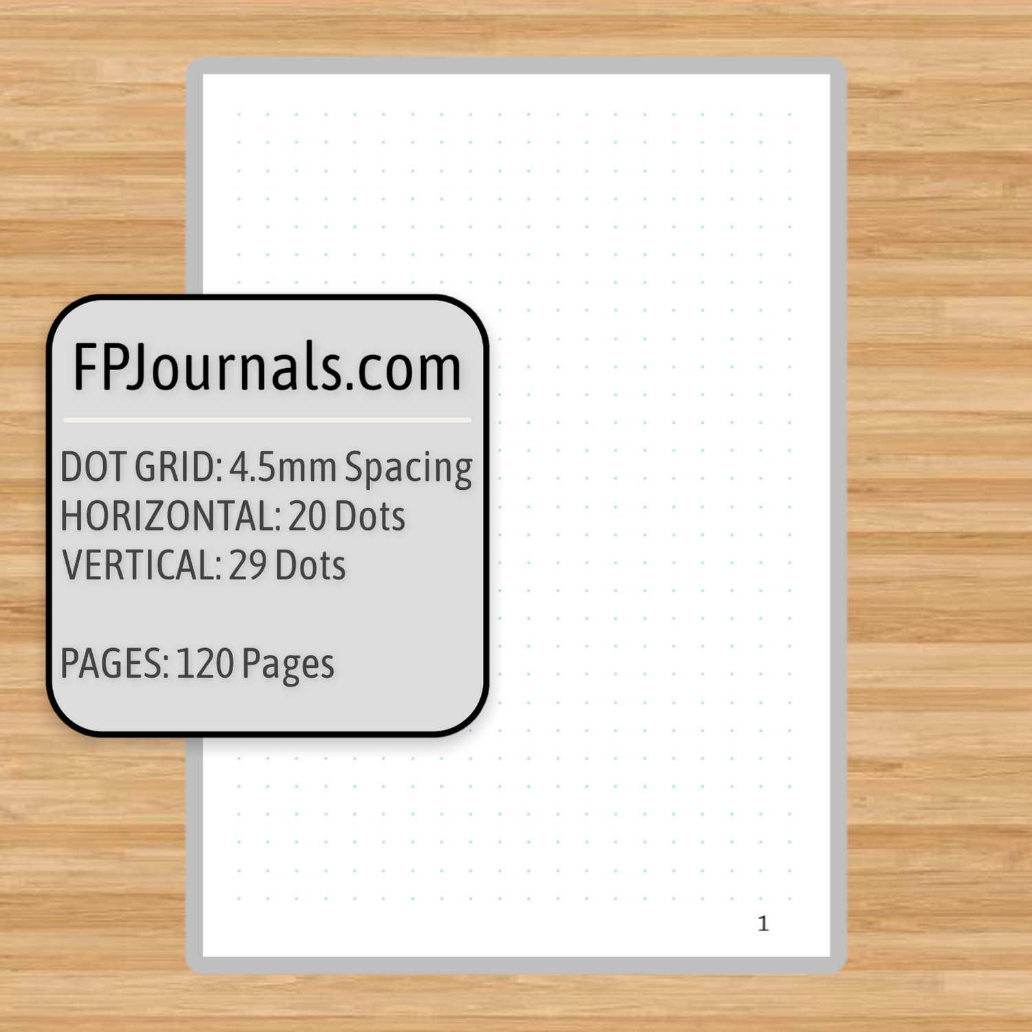 PAGES: 120 pages | 60 sheets of dot grid kokuyo (fountain pen friendly!) paper, with page numbers, dashboard, and index. Dot grid size is 4.5mm. There are 20 dots per row (horizontal) and 29 dots per column (vertical) on each page.